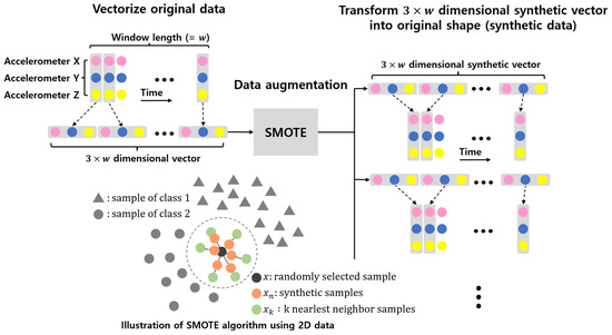 In classification problems, if there exists a significant difference in the amount of data for each class, the classification model biasedly trains the majority class, which may result in a lower classification accuracy [39]. One method to solve this problem is to equalize the amount of data in the majority and minority classes through data augmentation, which generates synthetic data similar to the original data [39,40,41]. In this study, synthetic data similar to the original data were generated using the oversampling technique, SMOTE [27]. Through data augmentation, the amount of data in each class was equalized; the amount of data was increased to improve the performance of the model. Steps 1–3 describe the data-augmentation process. The SMOTE algorithm augments windowed data because it has little effect on high-dimensional data for most trained classifiers [42]. The windowed data are 2D, and these 2D data are converted into a vector before applying the SMOTE algorithm. The vector is reshaped into original 2D data after data augmentation. Figure 1 illustrates the processing of windowed data before and after data augmentation and an illustration of SMOTE algorithm using 2D data.