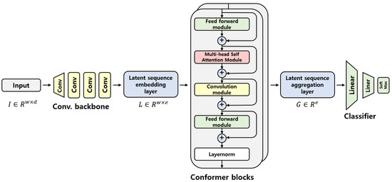 After the output of the conformer block, the temporal dimension is aggregated into one dimension, and this layer is the latent sequence aggregation layer. This can be expressed as . Assuming that the output from conformer blocks is and output of the latent sequence aggregation layer is , the formula is as follows: