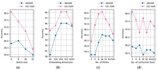 Optimal hyperparameters and batch size of the model; (a) accuracy according to batch size; (b) accuracy according to latent sequence embedding dimension; (c) accuracy according to the number of MHSA; and (d) accuracy according to the number of conformer block.