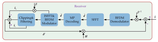 - The received signal is first de-attenuated by multiplying . Then, BFDM demodulation and SFFT transformation are performed on the attenuated signal to obtain the observation signal . Finally, the decision signal will be output when is substituted into MP algorithm for equalization and decoding.