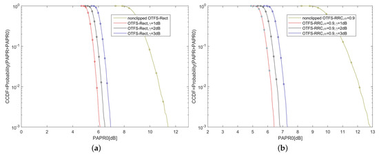 Figure 4 shows the CCDFs of the PAPR for OTFS-BFDM signals with different clipping ratios . As shown in Figure 4a, the PAPR of OTFS-Rect signal is unbearable high. After clipping, the PAPR can be significantly reduced. The of non-clipped OTFS-Rect signals is 11.5 dB at . After clipping with dB, the can be reduced by 4.7 dB. Moreover, the smaller the clipping ratio, the more significant the PAPR decreases since the clipping ratio is proportional to the clipping threshold. A similar conclusion can be drawn from Figure 4b.