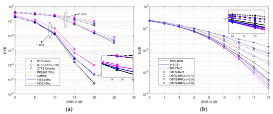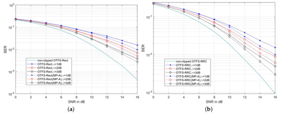 (a) BER performance of the MP-A [26] method in the clipped OTFS-Rect system on the channel with a maximum Doppler shift of 1935.48 Hz; (b) BER performance of the MP-A [26] method in the clipped OTFS-RRC system on the channel with a maximum Doppler shift of 1935.48 Hz (()).