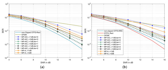 (a) BER comparison of the proposed MP-AIC method and MP-A [26] method in the clipped OTFS-Rect system on the channel with a maximum Doppler shift of 1935.48 Hz; (b) BER comparison of the proposed MP-AIC method and MP-A [26] method in the clipped OTFS-RRC system on the channel with a maximum Doppler shift of 1935.48 Hz ().