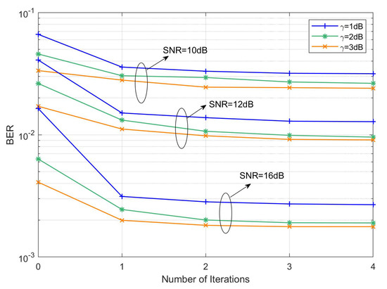 As shown in Figure 7a, the BER of the MP-AIC method decreases with the increase of iterations, because the residual clipping noise is gradually canceled out after several iterations. When the number of iterations increases from 0 to 2, the BERs of MP-AIC are , , and , respectively, at dB and SNR = 16 dB. It can be seen that the BER at is about 72% lower than that at since clipping noise is not considered at . In addition, with the increase of , the BER of MP-AIC also decreases, because the lager is, the less distortion of the signal. When dB, the BER of the MP-AIC with two iterations are and , respectively, at dB, while those of MP-A are, respectively, and . Then, the BER of MP-AIC is 53% lower than that of MP-A at dB. Similarly, in Figure 7b, when dB, the BER of MP-AIC with two iterations are and , respectively, at of 16 dB, while those of MP-A are, respectively, and . Then, the BER of MP-AIC is about 47.7% lower than that of MP-A at dB. To sum up, the BER performance of MP-AIC is much better than that of MP-A in canceling clipping noise interference.