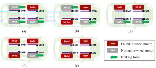 Braking failure of in-wheel motors: (a) Failure of one in-wheel motor; (b) failure of two in-wheel motors on two sides; (c) failure of two in-wheel motors on the same side; (d) failure of three in-wheel motors; (e) failure of four in-wheel motors.