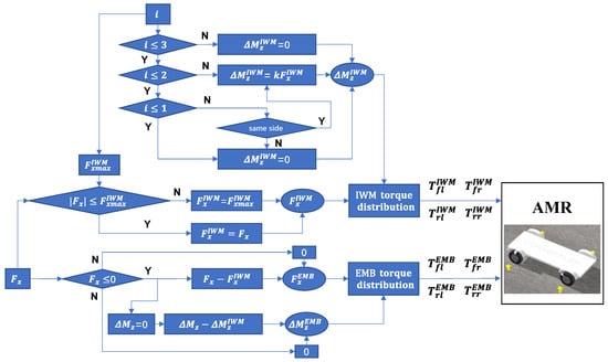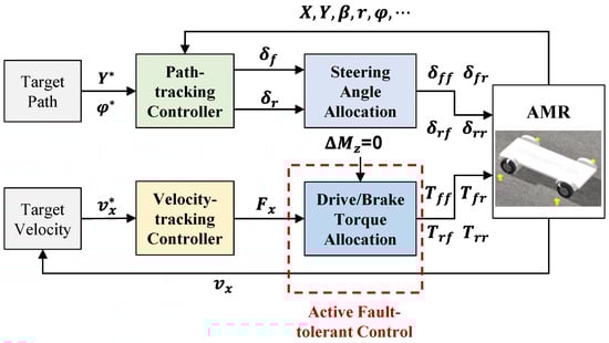 Compared with the traditional automated guided vehicles (AGVs), autonomous mobile robots (AMRs) have higher flexibility and intelligence, representing a more sophisticated, flexible, and cost-effective technology, in favor of smart manufacturing, smart factory, and intelligent logistics [1]. AMRs are usually equipped with multiple actuators for steering, drive and brake. Therefore, AMR is an over-actuated system since each wheel can provide independent traction force [2]. It is a critical issue to realize the coordinated control between multiple actuators [3,4].