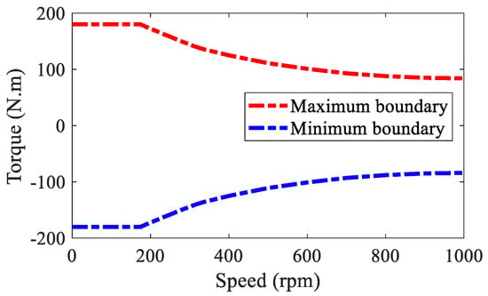 where denotes the weighting coefficient, which is usually set very large to minimize the torque distribution error, . denotes the desired control vector, . and denote the minimum and maximum control boundaries of , which is shown in Figure 5. and denote the weighting matrices. In this paper, and have the same allocation weights, i.e., , and are positively correlated, where denotes the vertical load of each wheel. Thus, .