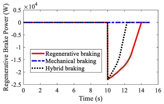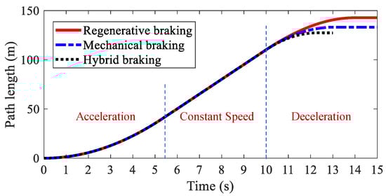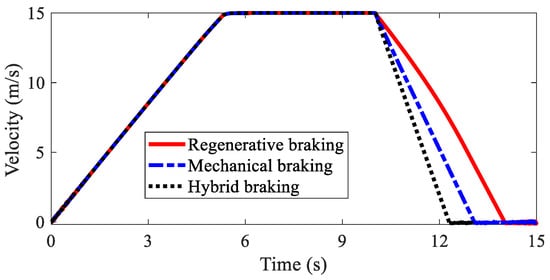 From the above simulation results, it can be seen that the regenerative braking mode was beneficial to braking energy recovery. However, it led to longer braking distance, which reduces braking safety. The mechanical braking mode could shorten the braking distance but not recover the braking energy. In general, the hybrid braking mode had the advantages of the above two kinds of braking modes, i.e., maximizing the regenerative braking efficiency and advancing the braking safety.