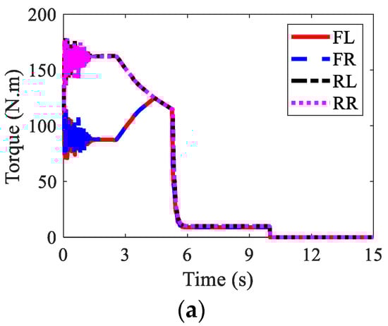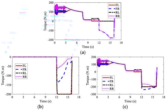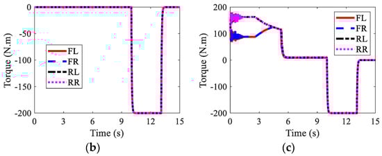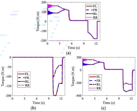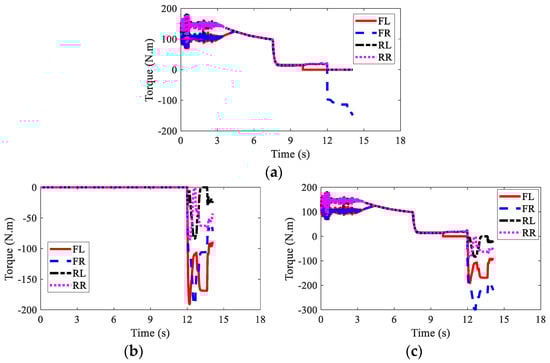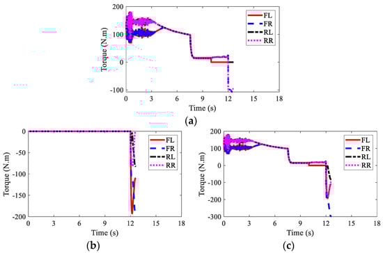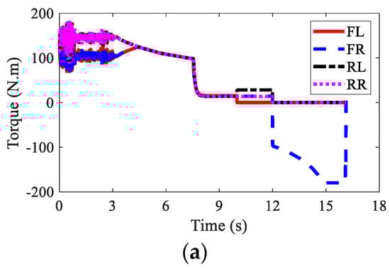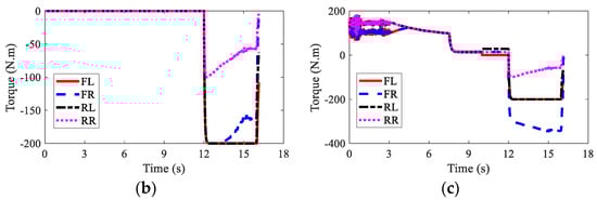 The wheel torques of AMR with failure and with AFTC are illustrated in Figure 17 and Figure 18, respectively. Due to the failure of FL and RL IWMs, the torques of the two IWMs changed to zero after the 10th second and the 12th second, respectively. Without AFTC, the AMR could not adjust its torque distribution to guarantee lateral stability. However, with AFTC, the EMBs redistributed the brake torque to compensate the braking force and overcome the external yaw moment caused by the braking failure of IWMs (Figure 18a,b).
