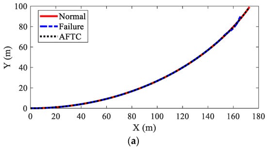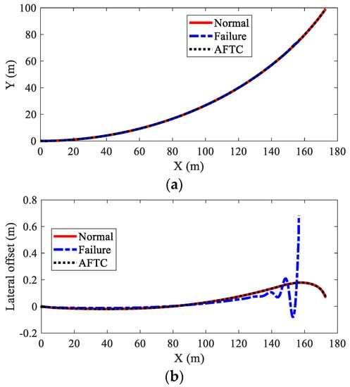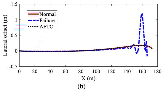 Figure 13 shows the path-tracking results of AMR under three kinds of conditions, i.e., normal (no failure), failure (without AFTC), and AFTC. It can be seen from Figure 13b that without AFTC, the AMR departed from its target path after braking failure, showing a large lateral offset. With AFTC, the AMR could realize lane-keeping after the braking failure and brake safely until stopped, as in the normal condition. The steering angles of AMR are illustrated in Figure 14. After the braking failure of IWMs, the AMR showed very large steering angles to realize lane-keeping when without AFTC. However, with AFTC, the AMR could use torque redistribution to guarantee brake safety and lateral stability.