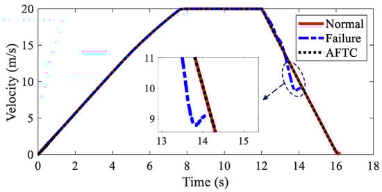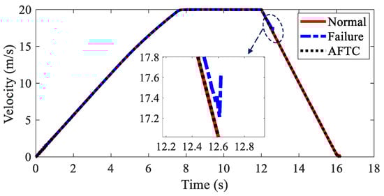 The velocities of AMR under three kinds of conditions are depicted in Figure 15. Due to the loss of stability, the simulation was stopped at the 12.6 s when without AFTC. The AMR could not finish the braking process after the braking failure of the IWMs. With AFTC, the AMR could realize safe braking as in the normal condition.