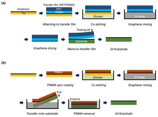 Schematic diagram of the transfer processes of chemical vapor deposition-grown graphene (Gr) on copper foil (Cu): (a) dry transfer and (b) wet transfer. PDMS: polydimethylsiloxane; PMMA: poly(methyl methacrylate); DI water: deionized water.