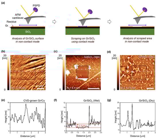 AFM was used to further examine the surface properties of Gr transferred onto SiO2, as shown in Figure 3. Figure 3a shows a schematic diagram of the scanning procedure for analyzing the surface morphology of the transferred Gr, which might include polymeric residue, cracks, and wrinkles. First, the surface morphology of samples was obtained over scanning areas of 5 × 5 μm2 (Figure 3b,d) and 3 × 3 μm2 (Figure 3c) in non-contact mode. Second, to confirm the presence of a polymeric residue on the Gr surface, the surfaces of samples were scanned using a cantilever under a 2-nN load in contact mode, thus effectively scraping over the samples, as shown by the 2 × 2 μm2 black dotted area in Figure 3b–d and the 1 × 1 μm2 area in Figure 3c. Finally, the scanned area in the first step was rescanned to verify the changes in surface morphology in non-contact mode. Figure 3b–d shows topography images of the surfaces of Gr/Cu and the wet- and dry-transferred Gr/SiO2 obtained in the final step of our AFM analysis. The topography images of Gr synthesized on Cu show step patterns with a root-mean-square (RMS) roughness of 7.74 nm, which were formed by reconstructing the surface of Cu during the synthesis of Gr at high temperatures (Figure 3b). The surface of Gr/Cu was not significantly changed after the scraping step and application of the AFM probe in contact mode. After the wet transfer process, however, the surface of Gr/SiO2 had an RMS roughness of 6.4 nm, and there was visible residue accumulation at the edges of the scraped area on Gr/SiO2 (Figure 3c). Compared with the surface of wet-transferred Gr/SiO2 covered with the residue, the surface of the dry-transferred Gr/SiO2 was slightly flattened, with an RMS roughness of 5.13 nm, although trapped bubbles between Gr and SiO2 were observed; in addition, there was no evidence of residue on the edge of the scraped area (Figure 3d). To measure the thickness of the polymeric residue on Gr/SiO2, we examined the line profiles of the topography images (white dotted lines in Figure 3e–g). Figure 3e shows similar surface profiles of Gr/Cu between scraped and non-scraped areas. However, the line profile of wet-transferred Gr/SiO2 displayed a distinct step of 1.5 nm thickness at the edge of the scraped area, corresponding to the thickness of the PMMA residue on the surface of Gr after the wet transfer process (Figure 3f). In contrast, in the line profiles of dry-transferred Gr/SiO2, the scraped and non-scraped areas could not be distinguished (Figure 3g). Thus, the results shown in Figure 3 confirm that the PMMA residue in the Gr after the wet transfer process was not locally present but instead covered the entire area, whereas there was no polymeric residue on dry-transferred Gr.