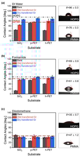 Contact angles of (a) deionized (DI) water, (b) formamide, and (c) diiodomethane on bare substrates, and wet- and dry-transferred Gr/substrate. The black and red dotted lines represent the contact angles of graphite (HOPG) and PMMA, respectively.
