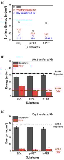 (a) Surface energy of bare substrates, and wet- and dry-transferred Gr/substrate. Dispersive and polar energy of (b) wet- and (c) dry-transferred Gr/substrate. The black and red dotted lines in (b,c) represent the dispersive and polar energy of PMMA and HOPG, respectively.