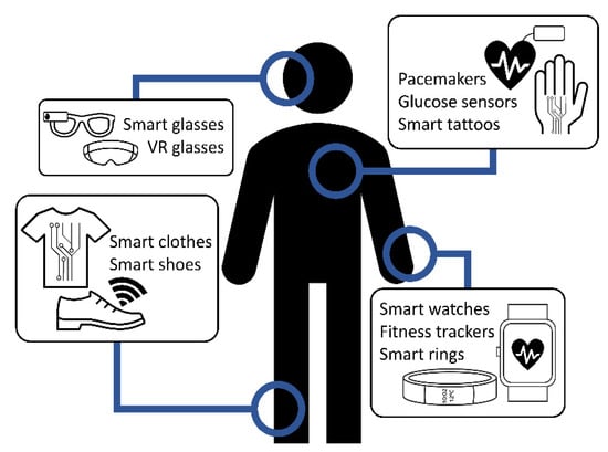 Wearables are smart devices that are usually worn as watches, bands, clothes or even skin implants. In Figure 1, some examples are presented. These devices normally include one or more sensors, a power source, a processing unit and wireless communication modules. The most common applications of these smart devices are healthcare [], activity tracking and sports [], education [], etc.