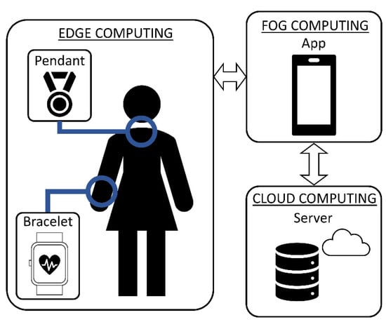 According to [], an IoT system can be divided into three main layers with different data computing capabilities: cloud, fog and edge. In Bindi, cloud computing is conceived as the remote server, fog computing as the mobile application and edge computing as the wearable devices. In Figure 2, the architecture of Bindi and the IoT layers for each component are shown.