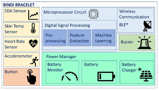 The smart bracelet in Bindi has three physiological sensors: a heart rate sensor, an electrodermal activity sensor (EDA) and a temperature sensor. The sampling frequencies are 100 Hz, 10 Hz and 5 Hz, respectively. The data collected from them are processed (noise elimination filtering, artifacts removal, signal quality assessment, band frequencies selection, main feature extraction and machine learning algorithms), encrypted and sent wirelessly through a BLE (Bluetooth® Low Energy) protocol with a data rate of around 1 kBps. Even though the bracelet can automatically detect fear by using the embedded machine learning algorithms, ciphered raw data from the sensors are sent so that the physiological signals can be kept in the server and can be used as judicial evidence in gender-based violent crimes. The bracelet also has other functionalities, such as a panic button, an accelerometer, a buzzer or power management, that can be seen in Figure 3.