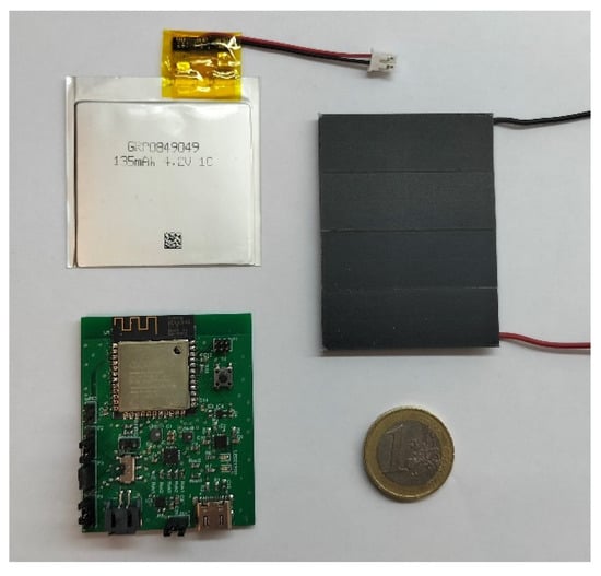 Using amorphous silicon flexible solar cells was also considered but, since their efficiency is lower than monocrystalline silicon solar cells, this consideration was discarded. The entire circuit (except for the battery and the solar cells) was integrated in a PCB (Printed Circuit Board). The PCB, the flexible battery and the solar cells module that form the complete device are presented in Figure 7. The dimensions of these components are 48 × 48 mm2, 60 × 45 mm2, 43 × 53 mm2 for battery, solar cells module and PCB board, respectively.