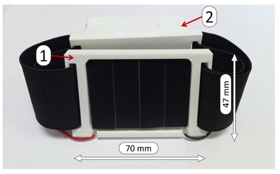 As for the second set of experiments, the designed device was tested as a wearable device by using a two-pieced, 3D-printed, flexible housing, as seen in Figure 8. The prototype is intended to be used as a bracelet, wearing each part of the housing on opposite sides of the wrist or the arm. The first part of the housing (marked as “1” in Figure 8) contains the solar cell semi-flexible module, while the second part of the housing (“2” in Figure 8) contains the PCB and the flexible battery. The user wore the prototype while performing four different Daily Routines (DR) in a city environment. This prototype can be worn easily, as the band is 45 mm in width and parts 1 and 2 are 70 × 47 mm2 (a cellular phone is around 70 × 150 mm2). Although this device is a prototype and not the final implementation, it has been designed as an accessory, used for street sports, running, jogging, bicycle, etc.