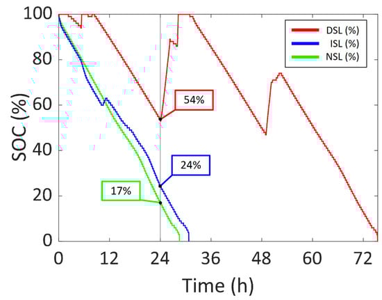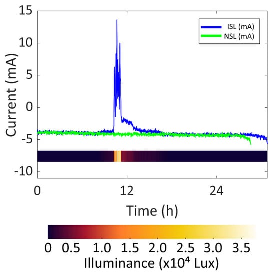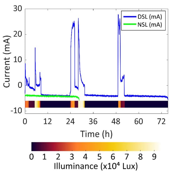 As for the DSL experiment, in Figure 11, the battery current vs. time of the DSL and NSL experiments are presented in blue and green respectively, so that the battery lifetime increase can be compared. Moreover, the illuminance vs. time during the DSL experiment is represented as a colour scale to gain information relating to the amount of light hitting the solar cells module. In this case, the battery lasted 75.42 h. As previously stated, the solar cells were covered after 55 h because the system reached an SOC of 100% in the first two days, as seen in Figure 9. This means that the device could have been permanently working under the same sunlight conditions.