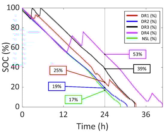 In Figure 12, the SOC of the experiments for four Daily Routines (DR1, DR2, DR3 and DR4) are presented in red, blue, black and magenta (respectively), compared to the NSL experiment in green. Furthermore, a vertical line is drawn at 24 h to compare the SOC after a whole day with the different DRs. In DR1, there were increases in the SOC due to using the device outdoors and receiving enough sunlight to recharge the battery. In the DR2 experiment, there was no increase in the SOC because of the cloudy weather. The sunlight outdoors was not able to recharge the battery; however, it was able to decrease current consumption and increase the battery life compared to NSL. In the DR3 experiment, there were two increases in the SOC at the start due to the user purposedly placing the device under the sun while being outdoors and in the office. On the second day, the user repeated the same process, but the device was not able to recharge the battery due to the cloudy weather. In DR4, the first and third increases were due to placing the arm next to a window and the second peak was due to outdoor lighting.
