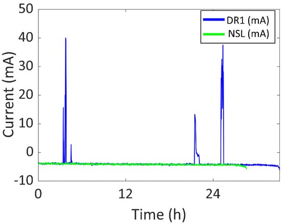 Battery current vs. time of DR1 and NSL experiments.