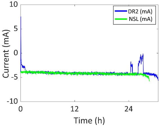 Battery current vs. time of DR2 and NSL experiments.