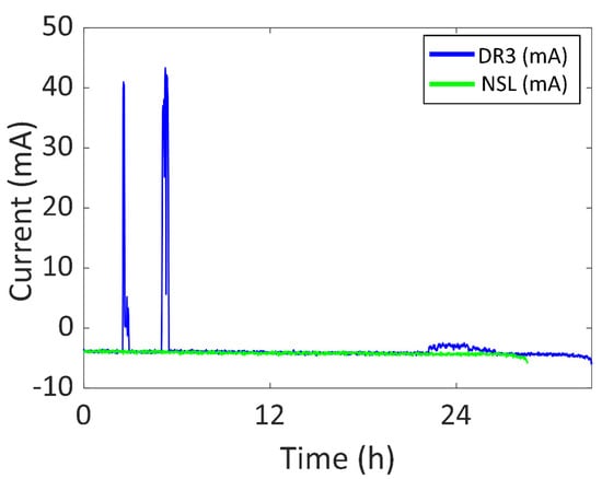 Battery current vs. time of DR3 and NSL experiments.
