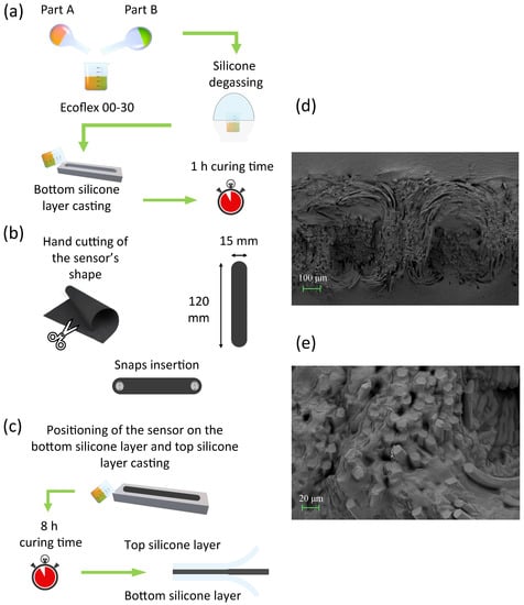 (a–c) Fabrication route. (a) Preparation of the silicone elastomer by mixing the two components, followed by degassing and casting of the bottom silicone layer. (b) Cutting of the resistive element and insertion of the metal snaps to endow the sensor with electromechanical connections. (c) Positioning of the sensor on the pre-cured bottom silicone layer and casting of the top layer. (d) SEM micrograph of the dual layer interface showing the silicone elastomer matrix positively infiltrating the textile. (e) SEM micrograph at higher magnification in the same region of interest.