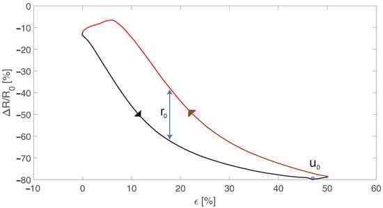 Hysteresis cycle showing the loading (black curve) and the unloading (red curve). is the maximum difference between the loading and unloading part of the cycle and is the maximum resistance value.
