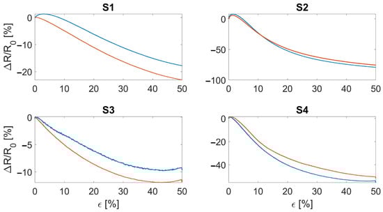 Subplots showing the relative resistance change of the manufactured sensors as a function of the applied strain. S1 and S2 refer to the bare textile cut in the course and wale direction, respectively. S3 and S4 refer to the bare textile cut in the course and wale direction encapsulated into the silicone matrix, respectively. The blue and red curves represent the two manufactured batches.