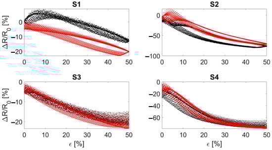 An example of electrical hysteresis of the developed sensors strained consecutively at 0.028 s−1. S1 and S2 refer to the bare textile cut in the course and wale direction, respectively. S3 and S4 refer to the bare textile cut in the course and wale direction encapsulated into the silicone matrix, respectively. The black and red curves represent the two manufactured batches.