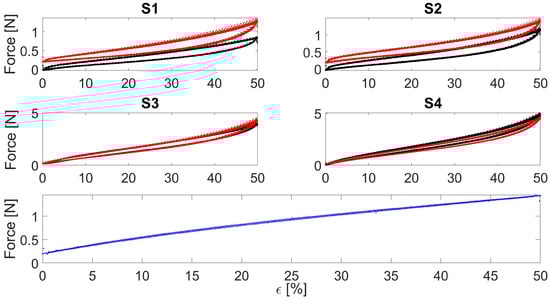 An example of mechanical hysteresis of the developed sensors strained consecutively at 0.028 s−1. S1 and S2 refer to the bare textile cut in the course and wale direction, respectively. S3 and S4 refer to the bare textile cut in the course and wale direction encapsulated into the silicone matrix, respectively. The black and red curves represent the two manufactured batches. The bottom blue curve shows the mechanical hysteresis of the silicone matrix alone.