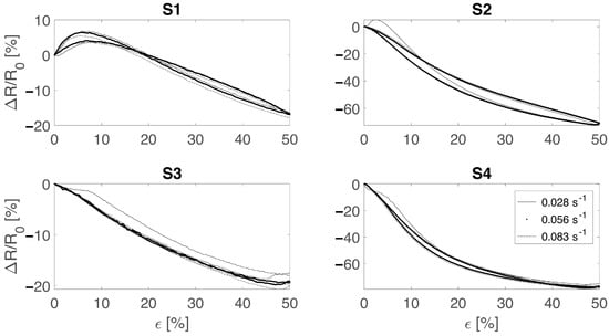 Strain rate influence on the sensors’ output tested at 0.028 s−1 (black continuous line), 0.056 s−1(black dots), and 0.083 s−1 (dashed line). S1 and S2 refer to the bare textile cut in the course and wale direction, respectively. S3 and S4 refer to the bare textile cut in the course and wale direction encapsulated into the silicone matrix, respectively.