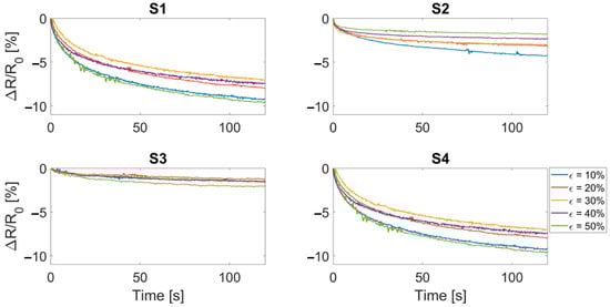 Resistance drift after a strain level was provided and held for 120 s. S1 and S2 refer to the bare textile cut in the course and wale direction, respectively. S3 and S4 refer to the bare textile cut in the course and wale direction encapsulated into the silicone matrix, respectively. Each color represents a strain level.