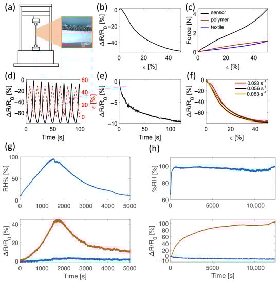 (a) Diagram of electro-mechanical test setup and cross-sectional stereophotogrammetric microscope image of the sensor. (b) Relative resistance change to 50% strain in quasi-static condition at 0.05 min−1. (c) Force trend during straining at 50% of the textile alone, the polymeric matrix alone, and the silicone-encapsulated textile (reported as sensor). (d) Relative resistance change to triangular cyclic straining to 50% at a speed of 0.056 s−1. (e) Relative resistance drift when 50% strain is maintained for 120 s. (f) Relative resistance change when strained to 50% at 0.028 s−1, 0.056 s−1 and 0.083 s−1. (g) Moisture influence on the sensor’s output. Relative humidity provided to the sensors is shown in the top plot. The bottom plot shows changes in relative resistance of the encapsulated sensor (blue line) and the bare sensor (red line). (h) Relative resistance changes of the sensor’s when exposed to 100% relative humidity for over 3 h. Relative humidity provided to the sensors is shown in the top plot. The bottom plot shows changes in relative resistance of the encapsulated sensor (blue line) and the bare sensor (red line).