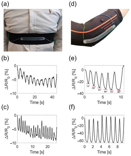 To monitor the respiratory activity, the sensor was placed at the center of an elastic belt provided with metal snaps for easy placement of the sensor and with Velcro strips to make it adaptable to different anthropometries (Figure 10a). The respiratory monitoring device could identify the different respiratory regimes allowing us to extrapolate the respiratory frequency of the volunteer, as shown in Figure 10b,c. In addition, inspiratory and expiratory peaks were visible and were represented by minima and maxima, respectively, thus allowing us to estimate the respiratory frequency from the inspiratory peaks. As a result, the volunteer breathed at 12 breaths-per-minute (12 bpm, which corresponds to 0.20 Hz) in the eupnea trial and at 45 bpm (which corresponds to 0.75 Hz) in the tachypnea trial. It can be noted that the device output showed a slight drift towards lower resistance values and this may be related to a slight drift of the sensor’s output combined with the volunteer not breathing with the same tidal volume. This aspect is negligible in the proposed application but may be relevant in other applications (for instance, if the wearable is used to estimate respiratory volumes). To monitor the elbow joint flexion/extension, the sensor was placed on top of the elbow joint as shown in Figure 10d. The device could identify the different elbow angles provided as an input. This is clearly visible from the device output signal shown in Figure 10e, where each minimum represents the maximum flexion reached. The increasing angle of the elbow due to flexion caused the device output to decrease accordingly and vice versa. In addition, the number of movements performed by the volunteer could be estimated, taking into consideration the trend shown in Figure 10f and by counting the number of either minima or maxima. Although the maximum value of resistance obtained from the maximum flexion is approximately constant, a slight change in the device output was observed for the full extension (i.e., the starting position, 0°).