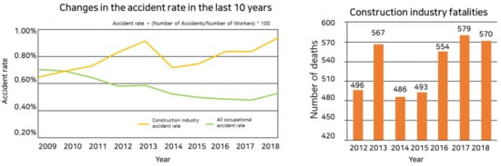 In addition, according to Korea’s construction accident statistics, the accident rate of all industries continues to decrease, as shown in Figure 1, while the accident rate of the construction industry is on the rise. Despite efforts to reduce these accidents, many deaths occur every year [2].