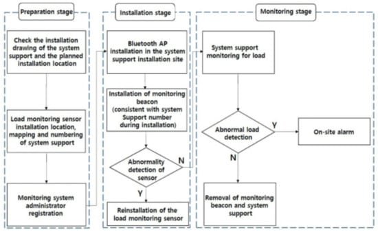 Figure 2 shows the system-support monitoring process. During the preparatory step of step 1, you will review the system support installation drawing and the planned location of the wireless load-cell, and programmatically number the mapping and system support locations. Then, register as an administrator of the monitoring system and enter the site name and its section. The installation step in step 2 installs the onsite Bluetooth AP and surveillance beacon. Check the sensor installation abnormality at the site before placing, and if there is an abnormality, you will need to reinstall the load monitoring. In the monitoring step of step 3, system-support load-monitoring is performed when there is no abnormality in the sensor installation. When an abnormal load is detected, a warning sound is heard at the site, and when the color of the warning light changes from green to yellow to red, the worker interrupts the work and understands the cause. Due to the conservative approach of the gradual load value, even if the warning light turns red, it does not indicate the hypothetical structural collapse, and the operator is instructed to interrupt the work and disperse the load.