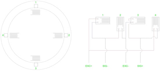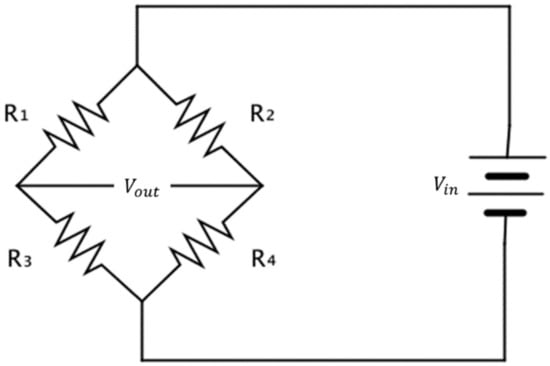 The Wheatstone bridge shown in Figure 3 is an electric circuit that detects slight changes in resistance. The change in resistance by strain is also converted using this circuit. The Wheatstone bridge is made up of four resistances. The gauges of through are attached as shown in the figure, and the output voltage before a load (force) is applied according to the electric flow can be expressed as follows: