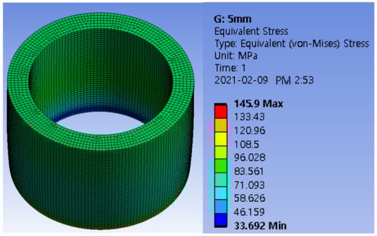 As mentioned earlier, figures. In Figure 4, only the compressive load region was modeled to determine the safety factor of the elastically deformable member to prevent permanent deformation under a load of 5 tons. The inner diameter of the cylinder is fixed at 34 mm. Equation (7) determines the safety factor required for maximum stress and yield strength. The safety factor was determined by obtaining simulation values through finite element analysis using the ANSYS simulation program as shown in Figure 5 and Table 2. The safety factor can be determined according to the material and load condition [23], this study choose the safety factor as 1.5 due to the material is well-known steel and the load and stress can be easily determined. Therefore, a wall thickness of 5 mm was chosen.