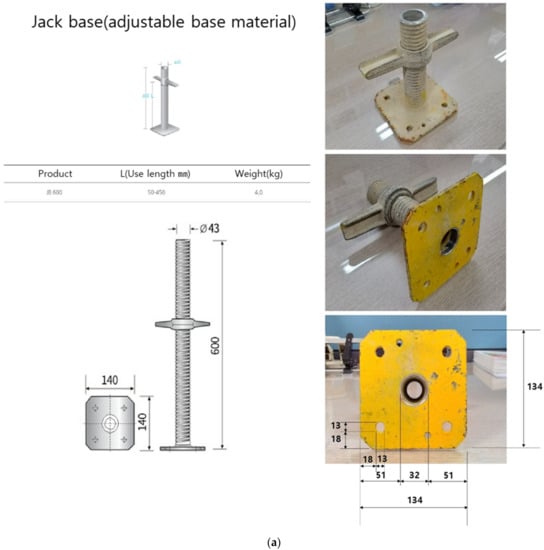 Scaffolding to which the prototype applies and drawings of the prototype. (a) Design of elastic strain member and Jack base: (bottom of system support/Jack base); (b) design of the elastic strain member.