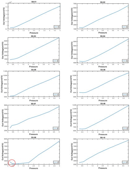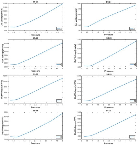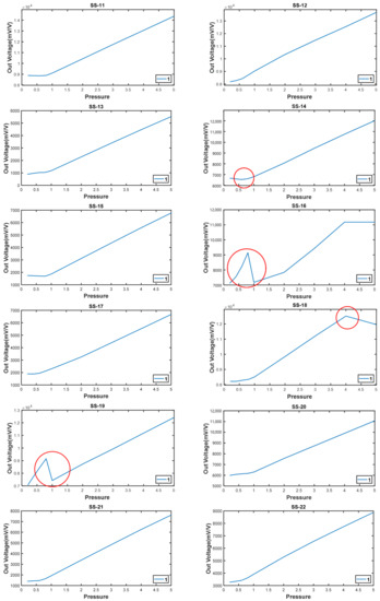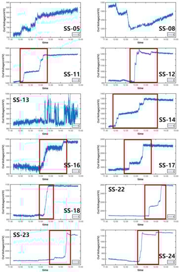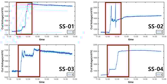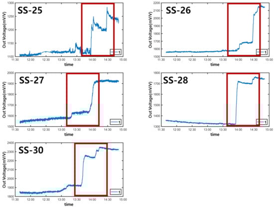 In Figure 26, the red box shows the significantly increased range. It can be seen that the output voltage value increases in the order of zone 1, zone 2, and zone 3 according to the injection direction. However, in the case of SS-05, SS-08, and SS-13 in Figure 26, the graph was not displayed properly due to buckling and eccentricity.