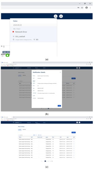 Monitoring screens (a) Notification push; (b) categorization of notification history; (c) viewing notification history.