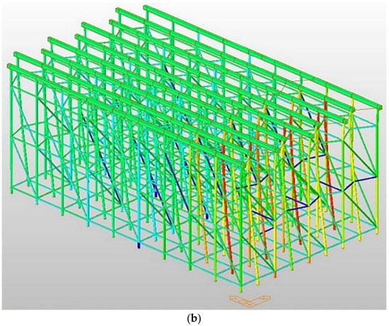 Figure 21 details the beam section’s joists, yokes, and system support. In order to secure structural safety when pouring concrete, it is appropriate to calculate the joist, yoke, and system-support interval according to the beam size (1000 × 1500) so that the site safety manager can check the installation interval between the joists, yoke, and system support. As shown in Figure 22, modeling review was conducted for concrete-distributed pouring and concentrated pouring. As shown in Figure 22a, in the case of distributed pouring, concentrated stress does not occur in the system support. As shown in Figure 22b, it was confirmed that the vertical load rises rapidly during concrete pouring, and concentrated stress is generated in the system support, which can lead to the collapse of the temporary facility.
