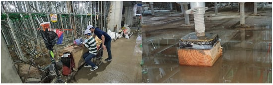 The field verification of the wireless load measurement monitoring system was applied and evaluated in the field where the system support was used, as shown in Figure 23. In order to observe the load change, concrete was poured on the upper part of the system support and the load change pattern by position was investigated in the installation section. The casting time took about 3 h and 30 min in total.
