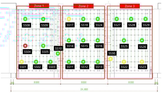 Figure 25 shows the color change of each device according to the load change as the concrete placement progresses. In each area, after pouring concrete, 3–4 workers will work to fill every corner with a vibrator. During this process, it was confirmed that at the beginning of the first injection, a red mark (dangerous load) appeared on one load cell when workers leaned against and piled up concrete high. However, it was confirmed that the concrete turned yellowish green because the concrete spread evenly around it. (The range of the color stage is set a little conservatively, so just because the red mark is displayed does not mean that it will collapse immediately.)
