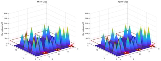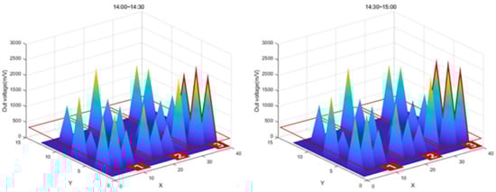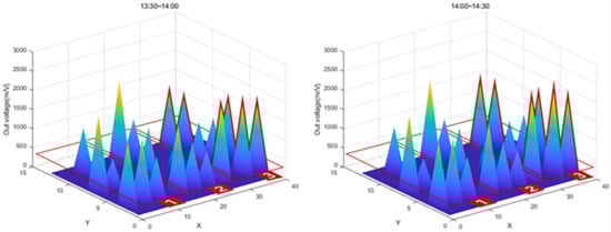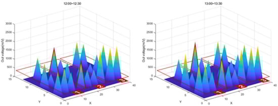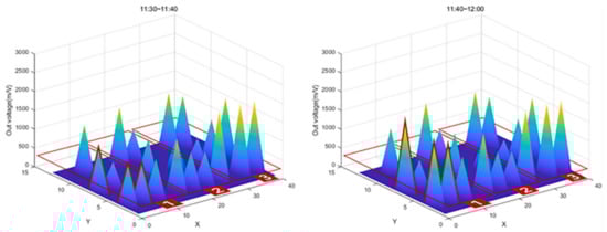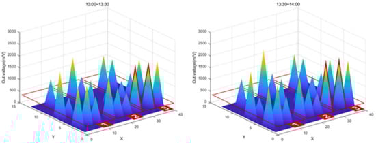 After the experiment, a large amount of data transmitted from the Bluetooth beacon was graphed using MATLAB as shown in Table 4. As shown in Figure 26, the values on the X-axis represent time and the values on the Y-axis represent the output voltage. As shown in the figure, the amount of change over time in the graph was confirmed by dividing the left (morning) part and the right (afternoon).