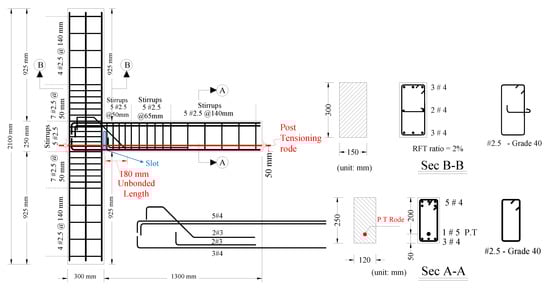 The dimensions and reinforcement details of the tested specimen are shown in Figure 1. In addition to the slotted joint, which is a half-inch-wide gap that extends over the bottom 3/4 depth of the beam (highlighted in blue in Figure 1), the connection also features 180 mm of unbonded rebar on the beam side of the slot (highlighted in Figure 1) to enable a reduced level of strain in the rebar. This innovative design aims to reduce the plastic hinge zone damage, limit the beam elongation, and enhance the low cyclic fatigue life of the beam longitudinal bottom rebars at the unbonded length. Additionally, near the slot, there is a 3/4-inch (19.05 mm) in diameter post-tensioning (PT) rod placed at 50 mm from the bottom face of the beam (Sec A-A in Figure 1) to simulate the compression in real beams under earthquake action [25]. For more details on the slotted connection concept, see [26].